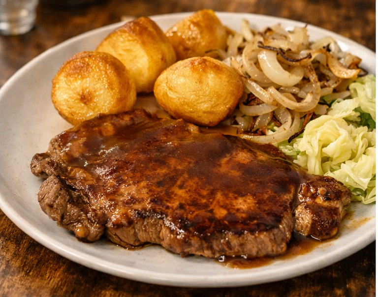 Two fried eggs, grilled bacon, grilled tomato, baked beans, two slices sausage, two slices sourdough bread toast