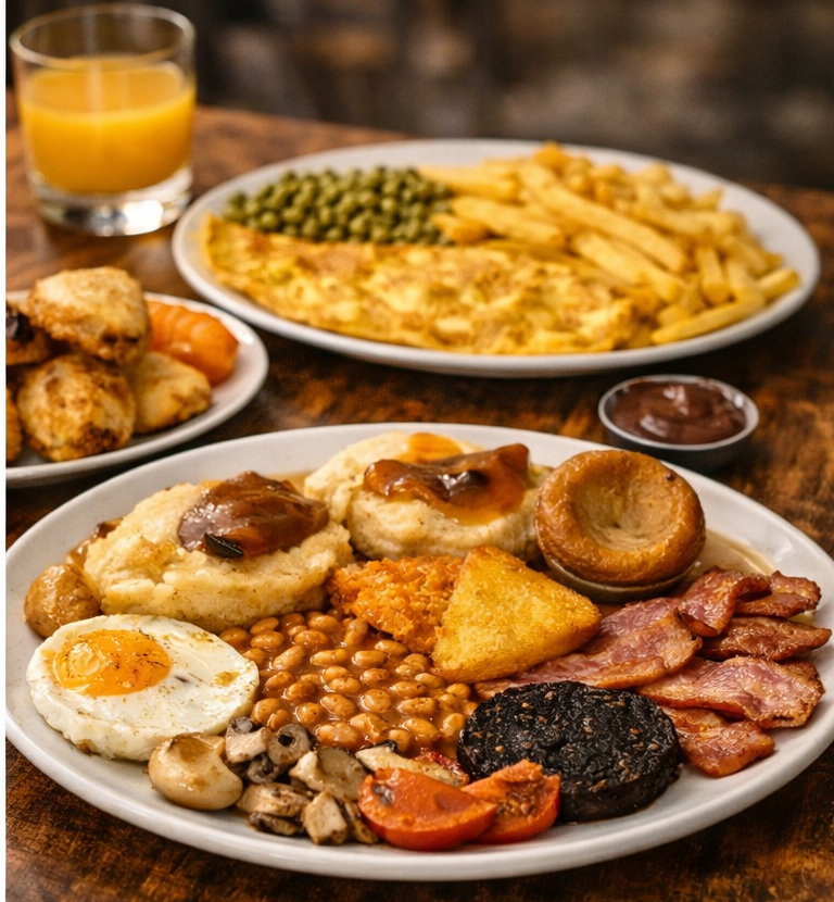 Egg, Bacon, Sausage, Mushrooms, Hash Brown, Tomato, Beans, Black Pudding